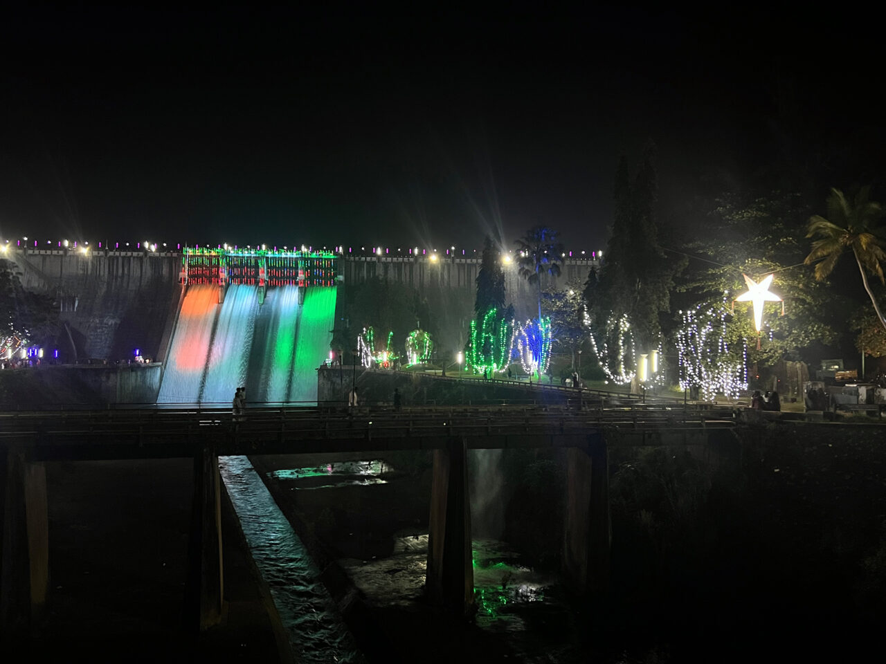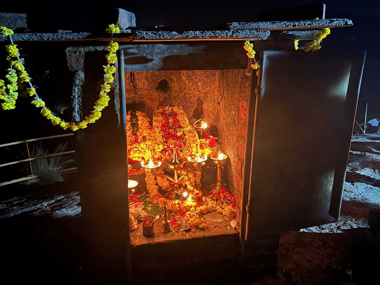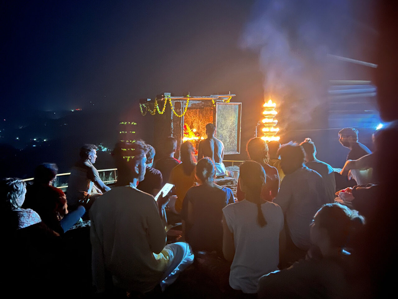 We also had a group evening excursion to a local summit temple for a spiritual event (Lokambika Puja). This turned out to be an evening of extremes. We left the grounds, as a group, around 8pm and immediately bumped into groups of school kids of all ages heading in the same direction. Then at the base of the hill, at the entrance to the town, and at the foot of the dam the action hit. Blaring music, colored lights and throngs of cars, kids, families and craziness. The holiday party had begun.